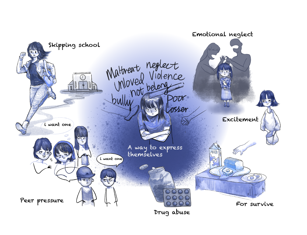 There are multiple risk factors that influence youth to commit theft, including traumatic experiences, violent behavior, emotional neglect, truancy, disregard for rules, and the need to survive, as well as the fact that youth offenders have a strong desire to express themselves, and therefore criminal behavior may be a manifestation of the youth offender's internal painful trauma, and the results of punishing delinquent youth for their painful behaviors by simply excluding them from society through incarceration will not change the status.